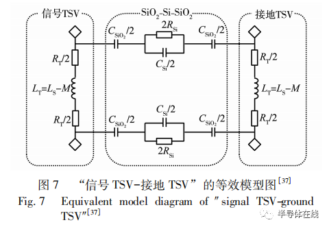 在 2. 5D/3D 封裝內(nèi)部,流過信號 TSV 的電流會將電磁波引入具有半導(dǎo)體特性的 Si 襯底中,這些電磁波會引起 Si 襯底中載流子的運動及濃度的變化,從而對周圍的有源器件和其他 TSV ( 如接地TSV) 產(chǎn)生電磁干擾,這就是 “封裝內(nèi)電磁干擾”。以信號 TSV 和接地 TSV 為例,二者可以構(gòu)成金屬-絕緣體-半導(dǎo)體-絕緣體-金屬結(jié)構(gòu),且二者的電流方向相反。其等效的模型圖如圖 7 所示。圖中:RT和 RSi分別為 TSV 和 Si 襯底的電阻; LT和 LS分別為 TSV 和串聯(lián)時等效的自感; M 為兩個 TSV 之間的互感; CSi和 CSiO2分別為 Si 襯底和 SiO2絕緣層的電容。當通過低頻電流時,電容起主導(dǎo)作用,因此決定信號傳輸速率的因素為兩個 SiO2層的厚度及節(jié)距,當 SiO2 層的厚度較薄、節(jié)距較大時,電容增大,會導(dǎo)致嚴重的信號損耗。當電流頻率逐漸增高時,電感逐漸成為主導(dǎo)因素,通孔高度、孔徑及節(jié)距等將對電感產(chǎn)生影響。各種寄生電阻、電容和電感是 TSV 之間產(chǎn)生電磁干擾的來源。在低頻段( <1 GHz) 時,電磁干擾會隨著絕緣層厚度的增加而減小; 在中頻段 ( 1 ~ 10 GHz) 時,電磁干擾會隨 著 通 孔 的 孔 徑 增 加 而 增 大; 在 高 頻 段( >10 GHz) 時,通孔孔徑對電磁干擾的影響減小,通孔高度和節(jié)距的影響增大,電磁干擾會隨著高度和節(jié)距的增加而增大。因此,對于不同工作頻率下的 2. 5D/3D 封裝芯片的 TSV,調(diào)節(jié)相對應(yīng)的影響較大的參數(shù)可以從設(shè)計上減小封裝內(nèi)電磁干擾的程度。