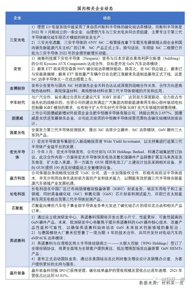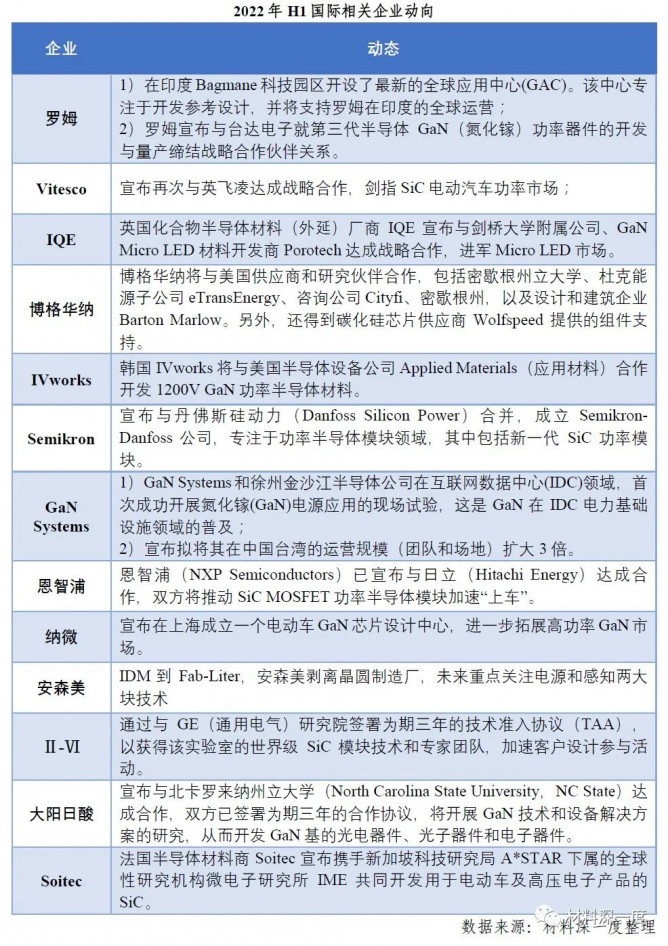 搶占市場和技術(shù)合作。通過梳理發(fā)現(xiàn),2022年H1,國外相關(guān)企業(yè)除投資擴(kuò)產(chǎn)、并購及新產(chǎn)品發(fā)布外,還在市場拓展和技術(shù)合作兩個方面動作頻頻。市場拓展方面,羅姆在印度Bagmane科技園區(qū)開設(shè)了最新的全球應(yīng)用中心(GAC)以支撐印度的全球運(yùn)營;Navitas在上海成立電動車GaN芯片設(shè)計中心以進(jìn)一步拓展高功率GaN市場;GaN Systems擬將其在中國臺灣的運(yùn)營規(guī)模(團(tuán)隊和場地)擴(kuò)大3倍,以滿足消費(fèi)電子、電動汽車、數(shù)據(jù)中心及工業(yè)電源等應(yīng)用領(lǐng)域?qū)aN功率晶體管不斷增長的需求,進(jìn)一步強(qiáng)化亞洲市場的業(yè)務(wù)。技術(shù)合作方面,Vitesco、IVworks、Semikron、恩智浦、Soitec、Ⅱ-Ⅵ等公司宣布對外合作事項,除IQE、太陽日酸外,其余9家均集中在功率器件(模塊)領(lǐng)域,集中應(yīng)用到汽車方向。可見,在未來一段時期內(nèi),汽車功率半導(dǎo)體依舊是第三代半導(dǎo)體的主導(dǎo)應(yīng)用方向。