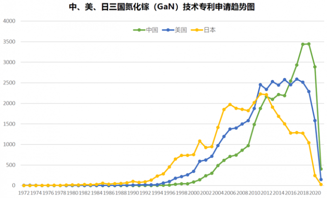 從氮化鎵領(lǐng)域全球技術(shù)布局來看,中國、美國和日本為氮化鎵技術(shù)熱點(diǎn)布局的市場。其中,美國和日本起步較早,起步于20世紀(jì)70年代初,而中國起步雖晚,但后起發(fā)力強(qiáng)勁(如圖4)。值得注意的是,目前全球的氮化鎵技術(shù)主要來源于日本。