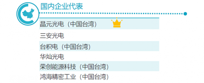 報告顯示,全球氮化鎵主要創(chuàng)新主體的龍頭主要集中于日本。氮化鎵產(chǎn)業(yè)國外重點(diǎn)企業(yè)包括日本住友、美國Cree、德國英飛凌、韓國LG、三星等(如圖5),中國企業(yè)代表有,晶元光電、三安光電、臺積電、華燦光電等(如圖6)。但目前中國企業(yè)和國外企業(yè)相比,專利申請數(shù)量仍有一定差距。
