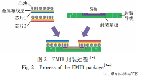 EMIB 封裝是在封裝基板中嵌入一小塊 Si 橋作為多片芯片的互連結(jié)構(gòu)。與臺(tái)積電的 CoWoS封裝類(lèi)似,首先仍是制備好需要進(jìn)行封裝的芯片,芯片背面磨薄,但正面有與封裝基板相連的凸塊,KGD 切割待用,無(wú)需封裝。同時(shí),EMIB 封裝無(wú)需Si 中介層,而是直接在封裝基板中嵌入具有互連功能的 Si 橋。然后將 KGD 倒裝、對(duì)準(zhǔn),直接與嵌有 Si 橋的封裝基板通過(guò)凸塊相連。EMIB 封裝的具體過(guò)程如圖 2 所示。與臺(tái)積電的 CoWoS 封裝相比,EMIB 封裝既不需要 TSV 工藝,也不需要 Si 中介層,因此其具有封裝良率高、設(shè)計(jì)簡(jiǎn)單、成本更低等優(yōu)點(diǎn)。