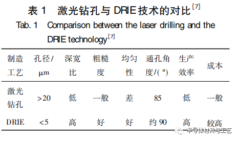 晶圓上的 TSV 形成是 TSV 技術(shù)的核心,目前的通孔加工技術(shù)主要分為兩種: 一種是激光鉆孔;另一 種 是 深 反 應(yīng) 離 子 刻 蝕 ( deep reactive ionetching,DRIE) 。表 1 列出了兩種不同通孔制作技術(shù)的對(duì)比。