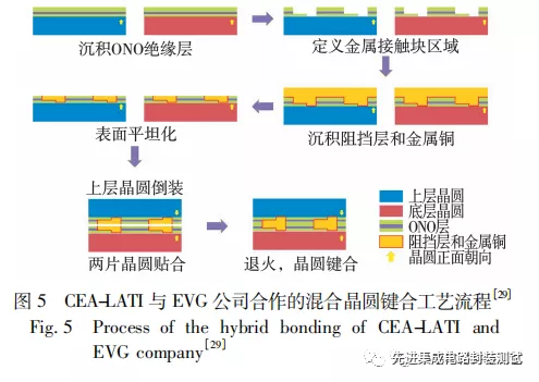 混合鍵合主要用于兩片器件晶圓的鍵合,而非器件晶圓與載片晶圓的鍵合。法國(guó)原子能委員會(huì)電子與信息技術(shù)實(shí)驗(yàn)室 ( CEA-LATI) 與 EVG 公司合作,于 2017 年 率 先 實(shí) 現(xiàn) 12 英 寸 ( 1 英 寸 =2. 54 cm) 晶圓的混合鍵合,其混合鍵合中的金屬接觸 塊 的 材 料 是 Cu,金 屬 接 觸 塊 的 間 隔 約 為1 μm?;旌湘I合的工藝流程如圖 5所示。首先,在兩片晶圓上沉積硅氧化物-硅氮化物-硅氧化物 ( ONO) 絕緣層,然后用大馬士革工藝定義金屬接觸塊區(qū)域,沉積 TaN/Ta 阻擋層并沉積 Cu,再進(jìn)行特殊的表面處理使表面粗糙度小于 0. 5 nm,最后,將一片晶圓倒裝與另一片晶圓貼合,在400 ℃下退火,使兩片晶圓形成鍵合。混合鍵合不需要載片晶圓或黏合劑,同時(shí)不需要 TSV 即可使兩片器件晶圓鍵合,具有成本低廉、工藝簡(jiǎn)單等優(yōu)點(diǎn)。