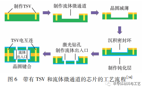 外部散熱措施會(huì)增加系統(tǒng)的復(fù)雜性,但是可以極大地提高系統(tǒng)的散熱能力。目前工業(yè)上采取的方法是在芯片或晶圓上增加熱管理微通道,可以使流體在微通道中流通,提高散熱效率。并在流體通道周?chē)O(shè)置密封環(huán),將流體與電互連隔絕開(kāi)來(lái)。具體的工藝流程如圖 6所示。在刻蝕 TSV 通孔后,會(huì)刻蝕出比 TSV 淺的流體微通道,晶圓減薄后,TSV 中的金屬會(huì)露出,但流體微通道仍保持密閉。