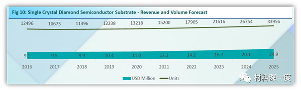 據(jù)有關(guān)機(jī)構(gòu)預(yù)測2020年全球半導(dǎo)體金剛石市場總量為4千萬美元,主要產(chǎn)品包括金剛石襯底、深紫外探測器等光電子器件等(可能包括把作為熱沉的散熱用金剛石)。有機(jī)構(gòu)預(yù)測,2025年金剛石襯底的市場總量為2.5千萬美元。金剛石市場的年增長率為10%左右。