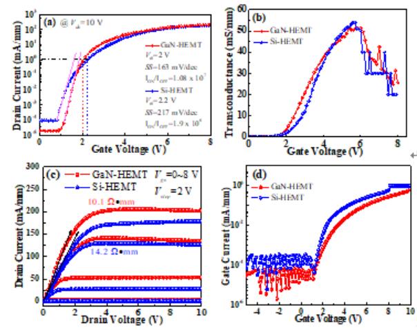 圖2所示。GaN和Si-HEMT在Vds為10v時的傳輸特性(a)、跨導(dǎo)曲線(b)、輸出特性(c)和對數(shù)坐標(d)下的柵極電流-電壓特性的半對數(shù)圖