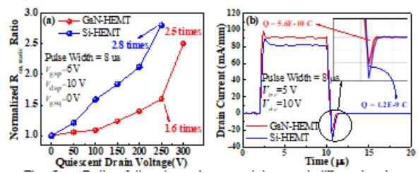 圖3所示。GaN和Si-HEMT在不同靜漏偏置點的動態(tài)通阻比(a)和動態(tài)恢復(fù)行為(b)。