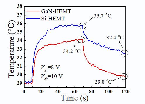 為了研究器件的散熱性能,采用微拉曼光譜紅外熱像儀對器件的溫度進行了測量。測量過程是先在8 V Vgs和10 V Vds下工作60 s,然后冷卻50 s。熱導(dǎo)率隨時間變化的曲線如圖4所示。當進行該裝置時,柵極區(qū)域的溫度迅速上升到一個較高的水平。隨著操作時間的延長,溫度繼續(xù)呈梯度上升。GaN和Si-HEMT的最高溫度分別為34.2和35.7℃,其中GaN- hemt的低溫度部分歸因于低通電阻。冷卻50 s后,GaN-HEMT的柵極溫度降至29.8℃。相反,Si-HEMT的積熱去除緩慢,50 s后達到34.2℃。顯然,與Si- hemt相比,GaN- hemt具有更好的散熱性能,盡管Si和GaN的導(dǎo)熱系數(shù)相近[21]。主要原因是兩種材料的界面處普遍存在較大的熱邊界阻力,導(dǎo)致熱不能立即傳導(dǎo)[25]。因此,GaN基板上的均勻生長有利于GaN電源器件的熱管理。