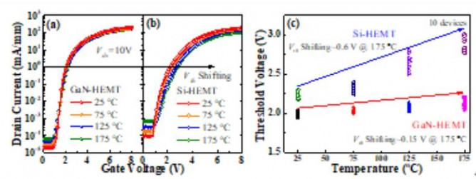 為了研究GaN和Si-HEMT的熱穩(wěn)定性,我們測量了從室溫(25℃)到175℃的傳遞特性,步長為50℃(圖5a和b)。對于具有明顯v值漂移的Si-HEMT, GaN- hemt的傳遞曲線幾乎重合。為了更通用,在兩個晶片中隨機選擇10個器件進行測量并計算平均第v移值。GaN-HEMT表現(xiàn)出良好的穩(wěn)定性,第V位移約為0.15 V至175℃,而Si-HEMT的第V位移為0.6 V(圖5c和d)。