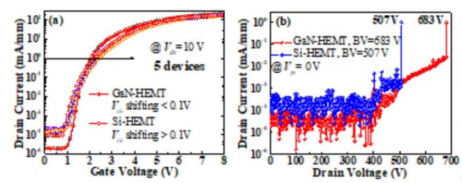 圖6所示。GaN和Si-HEMT的Vth均勻性(a)和脫態(tài)擊穿電壓(b)。