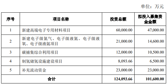 9月21日,金宏氣體發(fā)布公告稱,公司擬發(fā)行可轉(zhuǎn)債募資不超過10.16億元,扣除發(fā)行費用后的募集資金凈額將用于新建高端電子專用材料項目、新建電子級氮氣、電子級液氮、電子級液氧、電子級液氬項目、碳捕集綜合利用項目、制氫儲氫設(shè)施建設(shè)項目、補充流動資金。