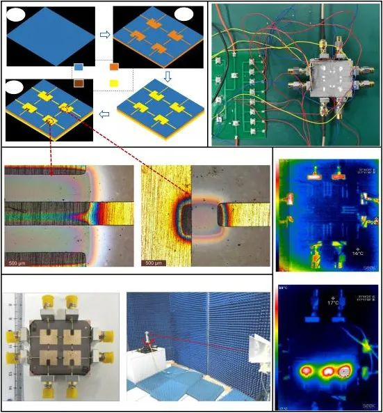 圖:熱控可重定義2×2微波無源陣列器件。A-D.微電子工藝制程;E-F.VO2薄膜;G.實物照片;H-I.測試及熱控平臺;J-K.熱控過程的紅外觀察。