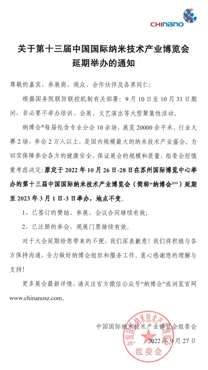 納博會(huì)?每屆包含專業(yè)分會(huì)10余場(chǎng)、展覽20000余平米、行業(yè)大賽2場(chǎng),參會(huì)2萬(wàn)人以上,是國(guó)內(nèi)規(guī)模最大的納米技術(shù)產(chǎn)業(yè)盛會(huì)。為切實(shí)保障參會(huì)各方的健康安全,保證展會(huì)的規(guī)模和質(zhì)量,組委會(huì)經(jīng)慎重考慮決定:原定于2022年10月26日-28日在蘇州國(guó)際博覽中心舉辦的第十三屆中國(guó)國(guó)際納米技術(shù)產(chǎn)業(yè)博覽會(huì)(簡(jiǎn)稱“納博會(huì)?”)延期至2023年3月1日-3日舉辦,地點(diǎn)不變。