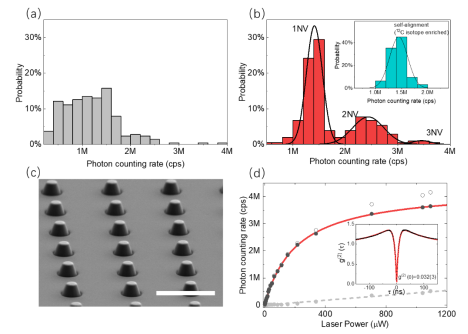 圖2:器件制造效果展示。(a)傳統(tǒng)工藝制造器件光學計數(shù)率分布;(b)自對準工藝制造器件光學計數(shù)率分布;(c)金剛石納米柱傳感陣列電鏡照片;(d)單個NV色心熒光飽和曲線測試。