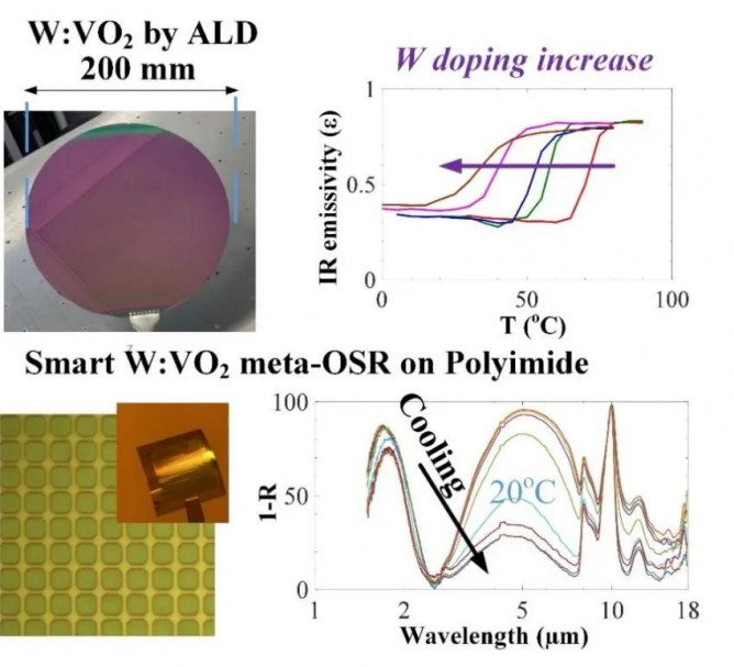 英國南安普敦大學物理學院以及電子與計算機學院課題組使用原子層沉積技術合成出鎢摻雜的二氧化釩(W:VO2)。該材料具有常溫相變特性,并且該技術兼容于大尺寸(8寸)硅基襯底以及聚酰亞胺(PI)薄膜?;谒谱鞯某叵嘧儾牧?,加工出新一代超表面航天器‘智能’溫控涂層(OSR)。