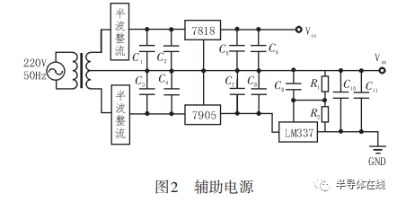 為了給芯片供電,設(shè)計如圖2所示的輔助電源,市電經(jīng)過變壓器 BK100VA 轉(zhuǎn)換成 24 V 和 6.3 V 的交流電,24 V經(jīng)過二極管半波整流,通過 7818和濾波電容得到+18 V直流電。6.3 V二極管半波整流,通過7905得到-5 V直流電,利用LM337調(diào)整為-4 V的直流電。
