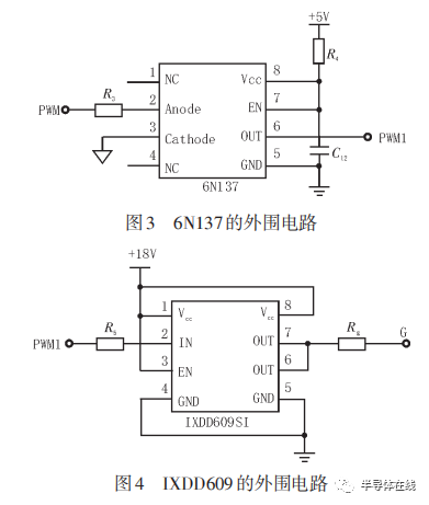 光耦 6N137 的外圍電路如圖 3 所示,引腳 2 輸入控制信號,R3與 R4分別為輸入和輸出信號的限流電阻,控制信號從引腳 6輸出。驅(qū)動芯片 IXDD609SI的外圍電路如圖 4 所示,引腳 1 和 8 VCC接 18 V 電源,驅(qū)動信號 PWM1 通過限流電阻 R5從引腳 2 輸入,引腳 4和 5 接 地 ,引 腳 6 和 7 通 過 驅(qū) 動 電 阻 Rg 輸 出 SiCMOSFET 柵極驅(qū)動的 PWM 波。