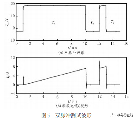 利用雙脈沖電路測試SiC MOSFET開關(guān)特性 ,續(xù) 流 二 極 管 選 取 SiC 肖 特 基 二 極 管 SCS210KE2,電 感取 0.5 mH,Rg為驅(qū)動電阻。雙脈沖驅(qū)動波形如圖 5(a)所示,T1區(qū)間開關(guān)導(dǎo)通 9 μs,漏極電流線性上升。T2區(qū)間通過碳化硅肖特基二極管續(xù)流 2 μs。T3區(qū)間開關(guān)再次導(dǎo)通 1 μs。漏極電流的仿真結(jié)果如圖 5(b)所示。