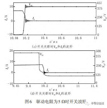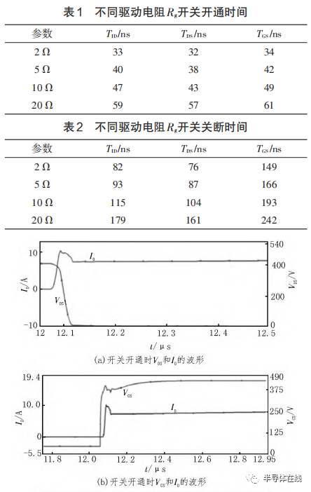 門極驅(qū)動電阻 Rg的大小影響開關(guān)速度及開關(guān)損耗,因此門極驅(qū)動電阻的選取非常重要 。表1和表2分別為不同的驅(qū)動電阻仿真得到的 SiC MOSFET 的導(dǎo)通和關(guān)斷時間。從結(jié)果可知驅(qū)動電阻越大,開關(guān)時間越長,開關(guān)損耗越大。因此 5 Ω的門極驅(qū)動電阻,既保證了開關(guān)速度又保證了系統(tǒng)的穩(wěn)定性。圖 6為電阻為 5 Ω時 SCT2080KE的開關(guān)特性。
