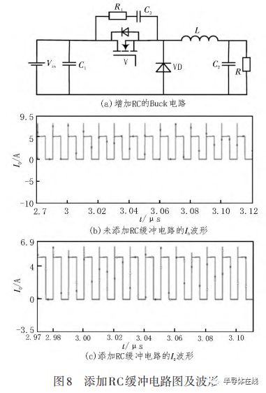 SiC MOSFET 在高頻下工作,開關(guān)過程中電流電壓震蕩嚴重,為了解決這一問題,在 SiC MOSFET的漏源極兩端并聯(lián) RC 緩沖電路。C 取 0.375 nF,R取 8 Ω/5 W。圖 8(a)為添加了 RC 緩沖電路的 Buck電路圖,圖 8(b)為未添加 RC 緩沖電路 SiC MOSFET漏極電流波形,可以看出波形震蕩嚴重。圖 8(c)為添加了 RC 緩沖電路 SiC MOSFET 漏極電流波形,電流的峰值從 9 A 左右減少到了 6 A 左右,RC 緩沖電路吸收了部分電流諧波,使得系統(tǒng)的運行更加穩(wěn)定可靠。