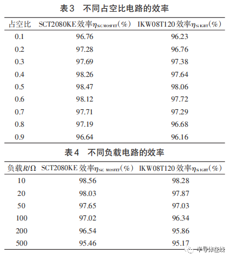 電路的效率為輸出功率與輸入功率的比值 。表 3為不同占空比 SiC MOSFET 和 Si IGBT 在 Buck 電路中的效率。從結(jié)果可知占空比在 0.5 左右時效率最高,占空比越大或者越小效率降低,SiC MOSFET比 Si IGBT在電路中的效率較高。
