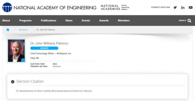 Palmour 在碳化硅和氮化鎵電子器件的制造和器件設(shè)計(jì)領(lǐng)域共發(fā)表了 386 篇科技著作,并擁有 81 項(xiàng)美國(guó)專(zhuān)利。美國(guó)國(guó)家工程院院士是工程界的最高專(zhuān)業(yè)榮譽(yù)之一,旨在表彰對(duì)工程研究和實(shí)踐做出杰出貢獻(xiàn)的人才,包括開(kāi)拓新興和發(fā)展中的技術(shù)領(lǐng)域以及在工程領(lǐng)域取得重大進(jìn)展的人才。