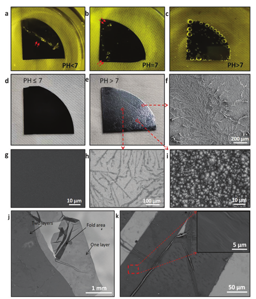 當樣品浸泡在1 mol L-1的HCl溶液中時(PH<7,圖2a)和去離子水(PH=7,圖2 b),兩種hBN薄膜分別從襯底邊緣到中心逐漸分離。最后,經(jīng)過較長時間,hBN薄膜從襯底上大面積剝離。當樣品被浸泡在1 mol L−1的KOH溶液中(PH > 7,圖2c),氣泡立即開始出現(xiàn)在襯底的邊緣。圖2d,e為剝離后的基板形貌。在PH≤7的溶液中浸泡的基材,剝離后表面光滑,與原始表面一致。然而,在PH為> 7的溶液中浸泡的基板表面表現(xiàn)出不均勻的特征。從邊緣的通道形態(tài)可以看出溶液蝕刻襯底的具體過程,由外向內(nèi)發(fā)散(圖2f)。中心位置的形貌很好地表明,蝕刻路徑從周圍的所有點延伸到中心(圖2h)。通過進一步放大襯底的圖像,進一步放大基片圖像,可以觀察到金字塔結構表面已經(jīng)被蝕刻(圖2i),這與PH≤7的基片(圖2g)明顯不同。
