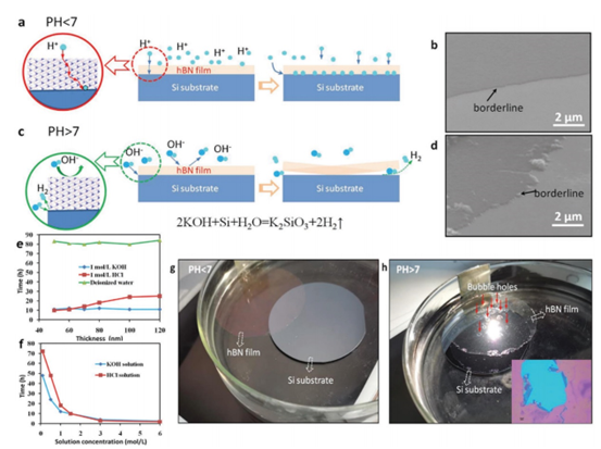 在酸性溶液(PH<7)中,hBN的六角蜂窩狀晶格的晶格常數(shù)(αh-BN)為≈2.504 Å. 氫離子(H+)的直徑為≈2.4 Å(范德瓦爾斯半徑為≈1.2Å),它小于αh-BN的值,并且可以通過聚集在BN原子周圍的價電子。理論上,少量H+從材料中獲得電子,形成H2,從而克服范德瓦爾斯力,促進薄膜和襯底的離解。在這個過程中,一些氫離子和其他大分子(如水分子)也可以從樣品邊緣進入hBN薄膜和襯底之間的間隙,導致整個薄膜剝離。堿性溶液(OH-)只能沿著hBN薄膜和Si襯底邊緣之間的間隙進入,并與Si反應生成氫(圖3c)。這樣,氫促進了hBN薄膜與襯底的分離。大量H2的產(chǎn)生使薄膜表面產(chǎn)生明顯的氣泡。對這兩種情況下剝離的薄膜邊緣的形貌進行了表征。用H+解離范德瓦爾斯力剝離的薄膜斷裂較少,薄膜邊界相對整齊(圖3b)。然而薄膜的分離依賴于氫,由于強烈的氣體沖擊,很容易導致薄膜破裂(圖3d)。剝離速度與0.1至6 mol L−1溶液濃度之間的關系如圖3f所示。隨著溶液濃度的增加,汽提速度加快。在高濃度的情況下,這兩種溶液的剝離速度幾乎相同。增加H+的溶解度也可以加速薄膜的剝離。