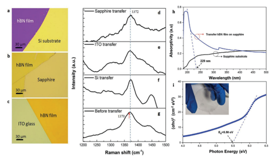圖4a-c顯示了被轉移到三種不同基底(另一種Si,藍寶石,ITO玻璃)上的剝離膜的典型光學顯微鏡圖像,在每種情況下都顯示出清晰的邊界。圖4d-g為轉移后hBN膜在不同基底上的拉曼光譜,并與剝離前的拉曼光譜進行了比較。這一結果表明,應力釋放是由薄膜的剝離和轉移引起的,從而導致拉曼特征峰的藍移。為了表征薄膜的吸收光譜和帶隙,將生長在Si襯底上的hBN薄膜轉移到2英寸藍寶石襯底上(圖4h中的插入件)。薄膜的帶邊吸收峰為229 nm(圖4h),對應的光學帶隙為5.50 eV(圖4i)。