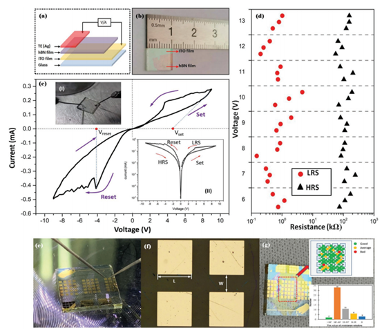 本文還討論了酸液剝離膜的連續(xù)性好、損傷小的性能。圖5a為透明RS器件結構,采用Ag/hBN/ITO三明治結構。圖5b顯示了將厚度為80 nm的hBN膜轉移到1×1 cm2的ITO玻璃上制備的器件的照片。圖5c顯示了Ag/hBN/ITO RS器件的典型電流-電壓(I-V)特性。圖5c中的insert I為探頭測試過程,insert II為半對數(shù)軸上的I - v曲線。本文驗證了RS元件在不同電壓下的電阻行為。HRS和LRS在不同電壓(6 ~ 13V)下的電阻如圖5d所示。結果表明,各組分的電阻窗口(R-HRS/R-LRS)沒有變化,保持在≈102。