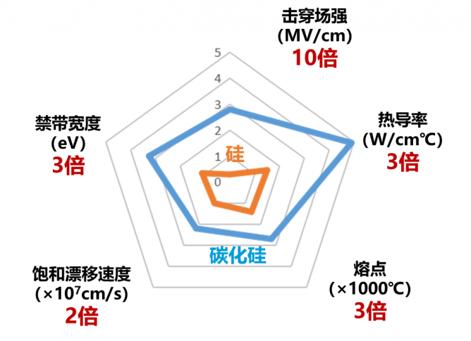 下圖給出了碳化硅材料與硅材料的性能對(duì)比,相比于硅材料,SiC材料具有3倍的禁帶寬度,可以承受比硅大10倍的電場(chǎng)強(qiáng)度,使得碳化硅器件具有耐高壓特性;同時(shí)其熱導(dǎo)率和熔點(diǎn)均為硅材料的3倍,使得碳化硅器件具有更高的耐高溫特性;此外,SiC材料的飽和遷移速度是硅材料的2倍,且具有更低的柵極電荷(Qg)和輸出電容(Coss),使得碳化硅器件具有高開(kāi)關(guān)速度特性。