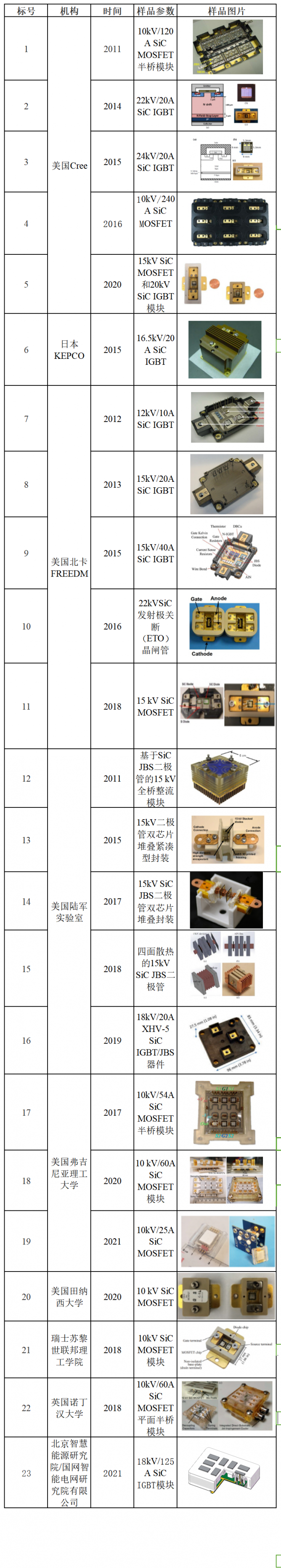 面向未來(lái)電網(wǎng)輸變電裝備的應(yīng)用,高壓碳化硅器件需要達(dá)到萬(wàn)伏級(jí)才能充分發(fā)揮其優(yōu)勢(shì)。目前,萬(wàn)伏級(jí)碳化硅器件封裝技術(shù)仍處于實(shí)驗(yàn)室研究階段。國(guó)外主要有美國(guó)Cree、日本KEPCO、美國(guó)北卡FREEDM、美國(guó)陸軍實(shí)驗(yàn)室、美國(guó)弗吉尼亞理工大學(xué)、美國(guó)田納西大學(xué)、瑞士蘇黎世聯(lián)邦理工、英國(guó)諾丁漢大學(xué)等。而國(guó)內(nèi)針對(duì)高壓碳化硅封裝技術(shù)的研究仍處于起步階段,公開(kāi)發(fā)表的成果較少,目前主要有北京智慧能源研究院對(duì)高壓碳化硅封裝技術(shù)進(jìn)行了一定的技術(shù)探索。關(guān)于萬(wàn)伏級(jí)碳化硅器件封裝的研究機(jī)構(gòu)及樣品的現(xiàn)狀詳見(jiàn)下表。