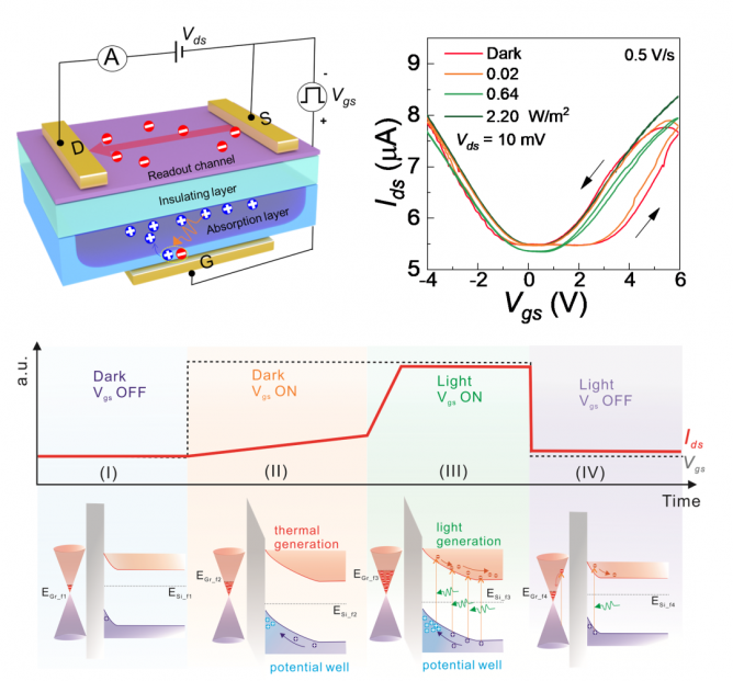 在吸收層中產(chǎn)生的光電荷存儲(chǔ)在范德華異質(zhì)結(jié)區(qū)的勢(shì)阱中,這使得電荷積分過(guò)程之后可以進(jìn)行弱信號(hào)檢測(cè)和成像。然后,讀出層中的晶體管以高填充因子的隨機(jī)存取方式無(wú)損地映射出收集的電荷。所演示的光電探測(cè)器同時(shí)結(jié)合了CCD和CMOS圖像技術(shù)的優(yōu)點(diǎn),并具有三個(gè)主要特點(diǎn):