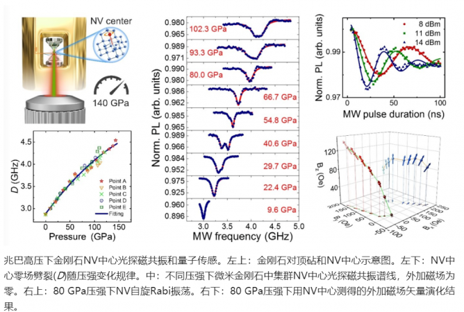 首次在兆巴高壓(1 Mbar=100 GPa)下實現(xiàn)金剛石氮空位(Nitrogen-vacancy, NV) 中心光探磁共振實驗測量,獲得NV中心自旋和光學性質(zhì)隨壓強變化規(guī)律,極大地拓展了金剛石自旋量子傳感的工作區(qū)間。
