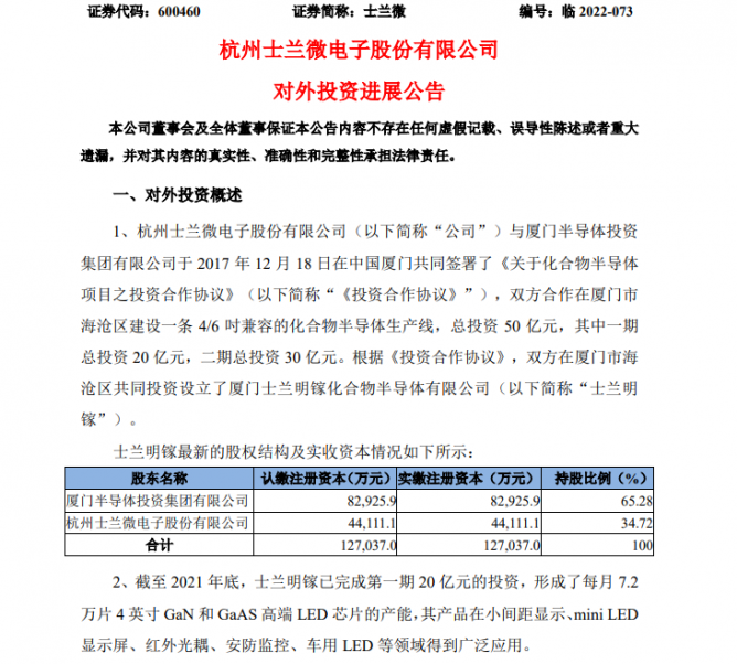 總投資20億元,二期總投資30億元。根據(jù)《投資合作協(xié)議》,雙方在廈門市海滄區(qū)共同投資設(shè)立了廈門士蘭明鎵化合物半導(dǎo)體有限公司。截至 2021 年底,士蘭明鎵已完成第一期 20 億元的投資,形成了每月 7.2萬片 4 英寸 GaN 和 GaAS 高端 LED 芯片的產(chǎn)能,其產(chǎn)品在小間距顯示、mini LED顯示屏、紅外光耦、安防監(jiān)控、車用 LED 等領(lǐng)域得到廣泛應(yīng)用。