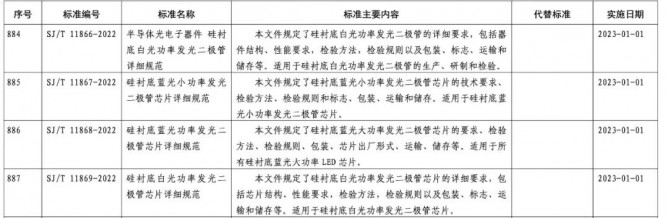 10月20日,《中華人民共和國工業(yè)和信息化部公告(2022年第23號)》公布,《半導(dǎo)體光電子器件 硅襯底白光功率發(fā)光二極管詳細規(guī)范》、《硅襯底藍光小功率發(fā)光二極管芯片詳細規(guī)范》、《硅襯底藍光功率發(fā)光二極管芯片詳細規(guī)范》、《硅襯底白光功率發(fā)光二極管芯片詳細規(guī)范》四項行業(yè)標準正式批準發(fā)布。