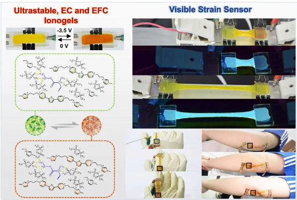 鑒于此,西安交通大學何剛、邵金友、劉子順聯(lián)合華中科技大學黃永安組成學科交叉研究團隊,在前期含硫族元素紫精的研究基礎上,將噻吩紫精電致變色材料與離子凝膠相結合,研制出具有應變感應性能的變色傳感材料。含噻吩紫精的離子凝膠兼具電致變色、電致熒光變色的特性,同時聚合物骨架的存在大大提升了電致變色材料的穩(wěn)定性,使得此類材料露置在空氣中數(shù)月甚至兩年之后仍具有良好的力學性能和電致變色性能(超過500次的拉伸循環(huán)和電致變色循環(huán))。更重要的是,該變色凝膠的電導率隨凝膠的拉伸程度明顯變化,導電率的變化進而影響了材料電致變色的性能,因而該材料可將拉伸信號轉化為光學信號,從而實現(xiàn)了對應變的可視化傳感。這項工作為研制可穿戴變色傳感器件提供了一種簡便易行的方法,具有巨大的應用前景和社會經(jīng)濟價值。