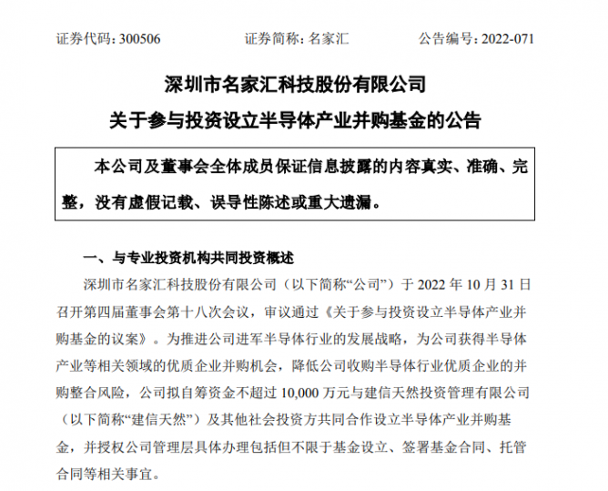 名家匯公告,公司擬自籌資金不超過(guò) 10,000 萬(wàn)元與建信天然投資管理有限公司及其他社會(huì)投資方共同合作設(shè)立半導(dǎo)體產(chǎn)業(yè)并購(gòu)基金,并授權(quán)公司管理層具體辦理包括但不限于基金設(shè)立、簽署基金合同、托管合同等相關(guān)事宜。