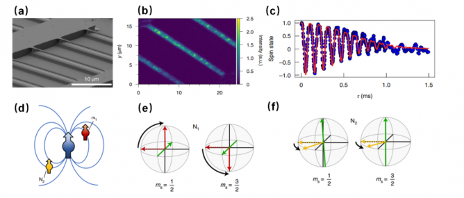 SiC除了在非線性光學(xué)領(lǐng)域受到關(guān)注之外,還在集成光量子芯片研究上取得了許多重要進(jìn)展。SiC中的固態(tài)自旋色心光源具有優(yōu)異的自旋性質(zhì),近期,來(lái)自中國(guó)科學(xué)技術(shù)大學(xué)的許金時(shí)團(tuán)隊(duì),利用離子注入制備的PL6色心在室溫下具備與金剛石NV色心相媲美的亮度(150k/s)和對(duì)比度(30%)[Natl. Sci. Rev. 9, 5, nwab122 (2021).]。在碳化硅色心與微腔耦合調(diào)控方面,斯坦福大學(xué)Jelena團(tuán)隊(duì)在薄膜中實(shí)現(xiàn)了單個(gè)硅空位色心的定位與調(diào)諧,該研究還表明與微腔共振的色心光源發(fā)射強(qiáng)度可提升120倍[Nat. Photonics 14, 330–334 (2020).]。單光子源與微納結(jié)構(gòu)集成是集成量子光學(xué)的主要技術(shù)途徑,通常情況下,與微納結(jié)構(gòu)集成的碳化硅色心面臨自旋性質(zhì)的衰退問(wèn)題(相比于體材料),而近期發(fā)表在Nature Materials上的工作利用低能量的He離子制備了與體材料SiC中色心具有同等自旋性質(zhì)的色心(圖2),這為下一步構(gòu)建基于碳化硅色心體系的集成光量子網(wǎng)絡(luò)奠定了基礎(chǔ)[Nat. Mater. 21, 67–73 (2022).]。