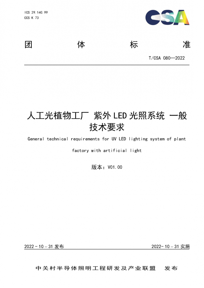 2022年10月31日,由中關村半導體照明工程研發(fā)及產(chǎn)業(yè)聯(lián)盟(CSA)標準化委員會組織,中國農(nóng)業(yè)科學院農(nóng)業(yè)環(huán)境與可持續(xù)發(fā)展研究所牽頭制定的T/CSA 080—2022《人工光植物工廠 紫外LED光照系統(tǒng) 一般技術要求》團體標準正式發(fā)布。