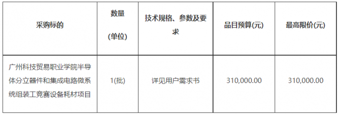 項(xiàng)目名稱:廣州科技貿(mào)易職業(yè)學(xué)院半導(dǎo)體分立器件和集成電路微系統(tǒng)組裝工競賽設(shè)備耗材項(xiàng)目