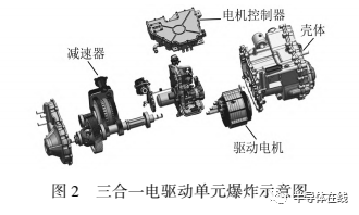 本文所述電驅(qū)動單元由電機(jī)控制器?驅(qū)動電機(jī)及減速器三部分組成,為“三合一“集成設(shè)計?其爆炸示意圖如圖2所示?