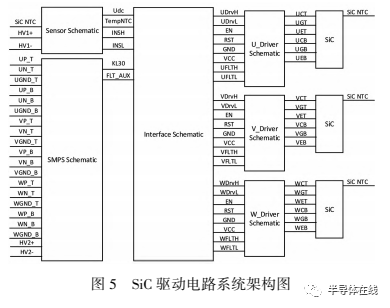 SiCMOSFET與SiIGBT應(yīng)用最顯著的差異為其驅(qū)動電路不同,SiCMOSFET短路保護(hù)響應(yīng)的要求更快[10],電壓平臺從400V提升到800V也對系統(tǒng)提出了更高的電氣間隙和爬電距離要求?本文SiC驅(qū)動電路設(shè)計系統(tǒng)架構(gòu)圖如圖5所示,包括驅(qū)動板接口?驅(qū)動芯片配置電路?驅(qū)動芯片保護(hù)電路?驅(qū)動電源供電電路以及模擬信號采集電路?