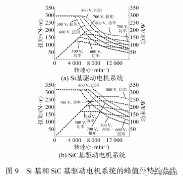 為驗證所設(shè)計系統(tǒng)的峰值扭矩和峰值功率輸出能力,分別在500?600?700?800V下進(jìn)行臺架外特性測試,其中臺架設(shè)置電機(jī)控制器為液冷,驅(qū)動電機(jī)為油冷,試驗時給定電機(jī)控制器的冷卻水溫為65"C,水流扯為10I/min,驅(qū)動電機(jī)的冷卻回油溫度為85"C?圖9給出了Si基和SiC基驅(qū)動電機(jī)系統(tǒng)的外特性曲線?