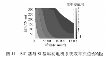 為驗證SiC與Si對測試的差異影響,本文在保持驅(qū)動電機(jī)和減速器設(shè)計不變的情況下,單獨更換SiC電機(jī)控制器與Si電機(jī)控制器,分別進(jìn)行臺架效率測試?圖11為兩者效率差值的MAP?從圖11可知,SiC基驅(qū)動電機(jī)系統(tǒng)效率高于Si基驅(qū)動電機(jī)系統(tǒng),平均效率可提升2%~3%?