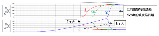 一般情況下,與MOSFET①相比,MOSFET③可以說是“反向恢復(fù)特性較差(Irr和trr大)”的產(chǎn)品。從這個(gè)仿真結(jié)果可以看出,反向恢復(fù)特性越差,dV/dt的坡度就越陡峭。這一點(diǎn)通過流經(jīng)電容器的瞬態(tài)電流通常用I=C×dV/dt來表示也可以理解。此外,在上述仿真中,Irr的斜率(di/dt)均設(shè)置為相同條件,但當(dāng)di/dt陡峭時(shí),dV/dt也會(huì)變陡峭。