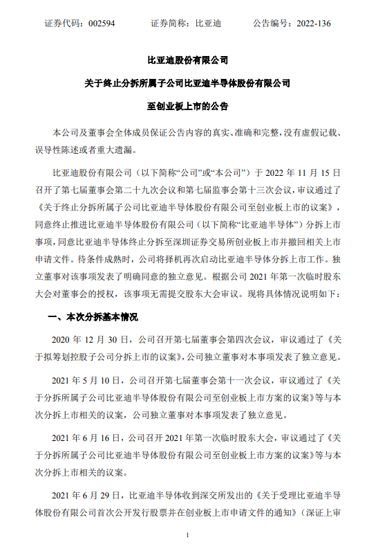 比亞迪發(fā)布公告稱,11月15日,董事會審議通過了 《關(guān)于終止分拆所屬子公司比亞迪半導(dǎo)體股份有限公司至創(chuàng)業(yè)板上市的議案》,同意終止推進比亞迪半導(dǎo)體分拆上市事項,同意比亞迪半導(dǎo)體終止分拆至深圳證券交易所創(chuàng)業(yè)板上市并撤回相關(guān)上市申請文件。待條件成熟時,公司將擇機再次啟動比亞迪半導(dǎo)體分拆上市工作。