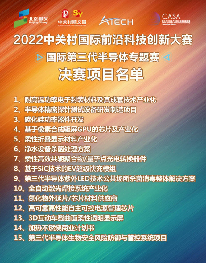 第三代半導(dǎo)體集結(jié)號(hào)角已經(jīng)吹響,乾坤未定,皆為黑馬!2022中關(guān)村國(guó)際前沿科技創(chuàng)新大賽-國(guó)際第三代半導(dǎo)體專題賽決賽在即。群雄逐鹿誰將最終問鼎?11月18日,讓我們拭目以待!