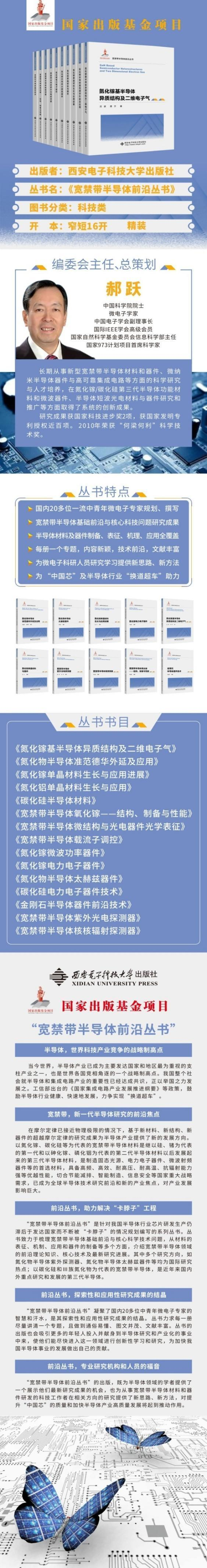 該叢書籌劃三年來,在郝躍院士的積極籌劃下,依托微電子優(yōu)勢學(xué)科地位,邀請鄭有炓院士、劉明院士、江風(fēng)益院士及北京大學(xué)、南京大學(xué)、中國科技大學(xué)、中山大學(xué)、西安電子科技大學(xué)、山東大學(xué)、中科院微電子研究所、中科院半導(dǎo)體研究所、中科院蘇州納米技術(shù)研究所等十余所高校、研究所近40位中青年微電子專家組成強(qiáng)大編委會。經(jīng)西電出版社積極申報,成功入選2021年國家出版基金項(xiàng)目。