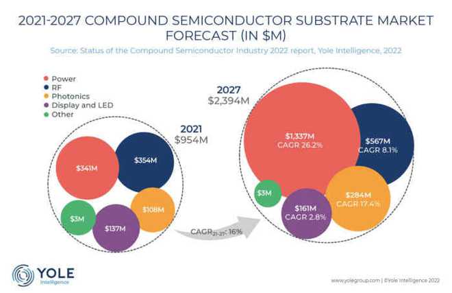 研究機(jī)構(gòu)Yole Intelligence日前發(fā)布對(duì)化合物半導(dǎo)體襯底市場(chǎng)的預(yù)測(cè),認(rèn)為在功率和光學(xué)應(yīng)用驅(qū)動(dòng)下,到2027年市場(chǎng)規(guī)模將達(dá)到24億美元,2021-2027年間復(fù)合年增長(zhǎng)率為16%。